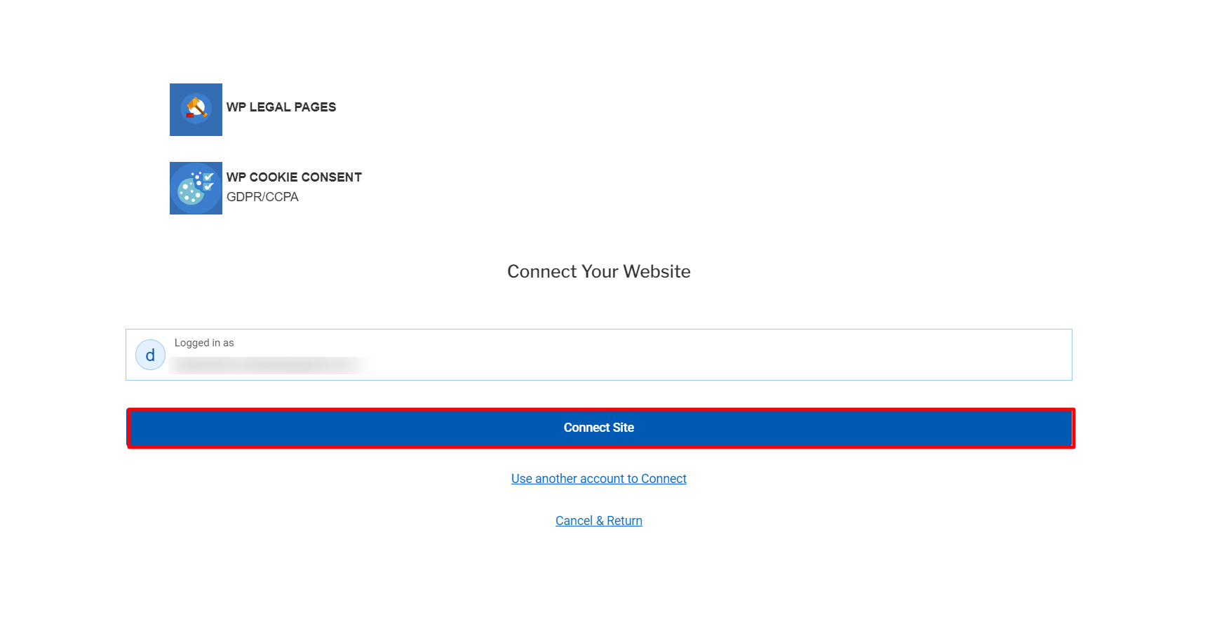 Click on the WP Legal Pages or WP Cookie Consent menu in your WordPress dashboard; you’ll see an option to connect or connect your account.