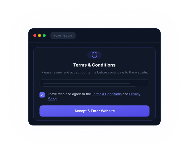Require users to explicitly accept your terms and policies before accessing your content or creating an account. Build legally defensible consent records for complete compliance.