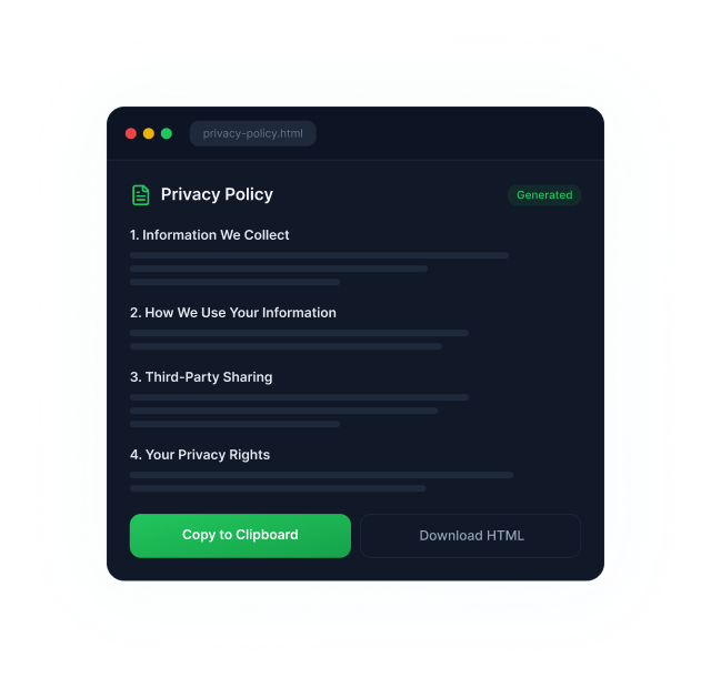 Generate professional legal documents with just a few clicks. Our intelligent generator analyzes your website’s needs and creates customized, legally-compliant policies that are ready to publish instantly.